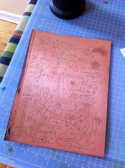 My idea was to wraw giant fidgetglyphs onto the copper, and my first achievement ("my tongue y/our eyes") was relatively successful, but tiring to create. It was so large that it took me at least an hour to create. And it was dense with words, with drawings, with wrawings (not quite writing, not quite drawing). This piece was so much larger and much complex than a usual fidgetglyph that I felt tired afterwards, not physically tired, but intellectually so. I wasn't sure if I had any of this brand of imagination left in me.