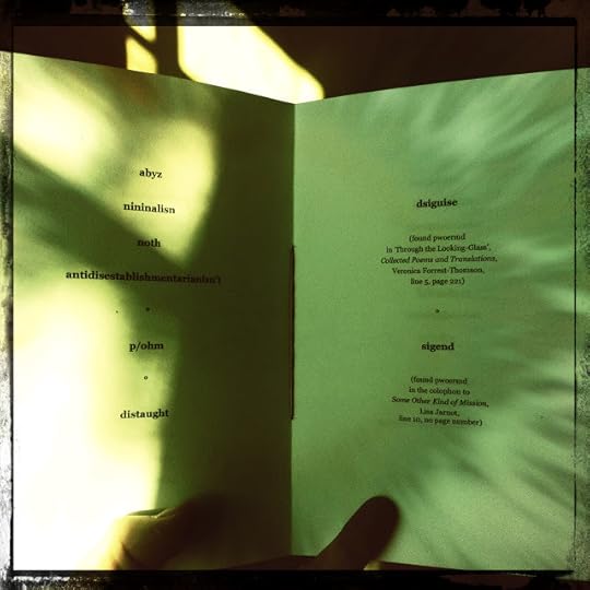 And for a few more I give you a green page from the book, which has only a green cover and white pages. I made it green so you could appreciate its vernal fecundity. And don't forget to appreciate his found pwoermds (and the wonderful bibliographic detail that accompany them).