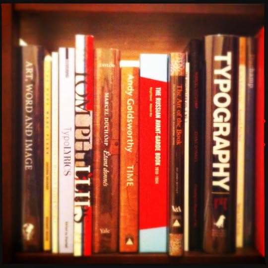 These books, even unread, define me. Take one shelf, and you'll see that I am interested in the typographic, the visual, the poetic, the conceptual. You will already see, from this small sidetable's holdings, that I am a visual poet (or, less likely, one of those very rare few who enjoy visual poetry yet never create any).