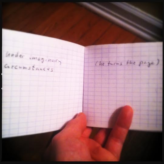 The book is designed as a performance, but not one by Márton, but one by us, the readers. We are the ones who dutifully turn the page when the page says to us "(he turns the page)," the parentheses suggesting a whisper, a slight prodding.