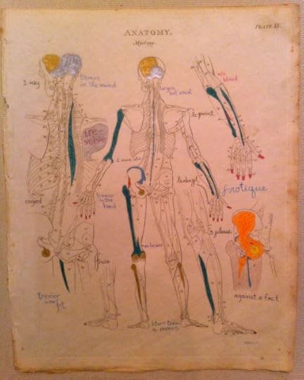 I thought of muscles as I sat at the table, in light not quite bright enough, to color as a child might with pencils, and to write the occasional word or phrase, on a slightly foxed plate removed from a damaged book, the holes where the needle and thread went through it still visible along its left edge.