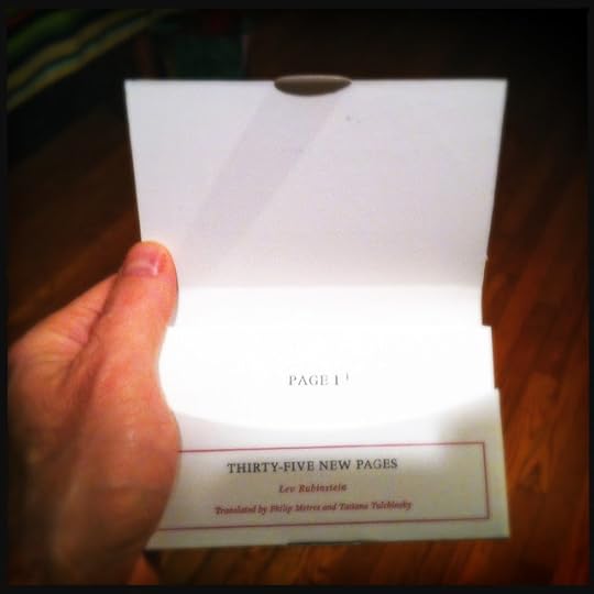 I am drawn to books of poetry on cards, and I didn't realize it until today. Robert Grenier's Sentences . Susan Howe's Poems Found in a Pioneer Museum . bpNichol's still water . The many many works of poetry that Márton Koppánny has produced on cards. To that list, I will now add Lev Rubinstein's Thirty-Five New Pages , recently published by Ugly Duckling Presse.