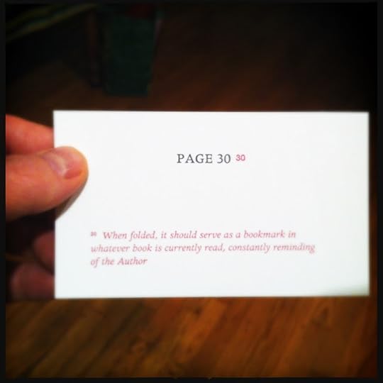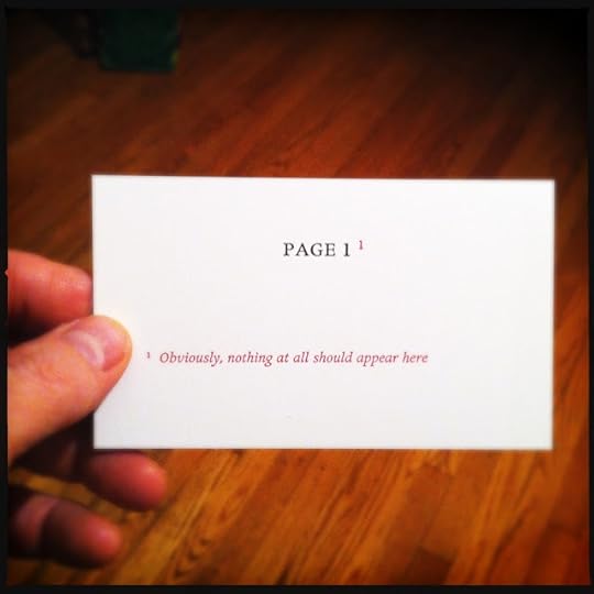As we might guess, the first card should be blank, a blank flyleaf before the title page, and then the numbers pull you into the book that is nothing but a deck of stiff cards in our hands. Rubinstein plays games with you as thoughts slowly and indefinitely arise from the sturdy pages in your hands. "Here," you read in the fourteenth footnote, which appears on Page 14, "something should be written," and you realize it has been. These are conceptual games, but serious, and satisfying. I smiled broadly near the end of the book, filled with a kind of joy at the beautiful rendition of the book's own genius in my head.