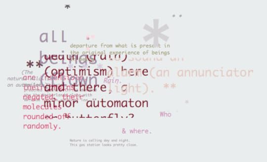 I am reminded most, in these cards, of the work of Márton Koppánny, which is also conceptual in this playful way (though also much more visual in intention), and that is a good thing. This text is clean, emotionless, without subject, because it is all subject, because it is about us, about the act of reading, and about the expectations we bring to any process of reading. The book may be a bit pricey given its size, but the joy of reading it doesn't diminish with time.