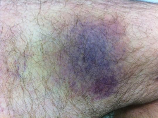 The next morning, my leg was still sore, but not much. I had no bruise on my leg at all, and as the days passed my pain slowly subsided. Then on the morning of the eighth day after my accident, I sat down on the toilet and noticed a brand new bruise on my leg, but on the inside of my thigh. It was large, deep purple in the center, flaring out into red, and dissipating finally into that sick shade of green associated almost entirely with bruises.