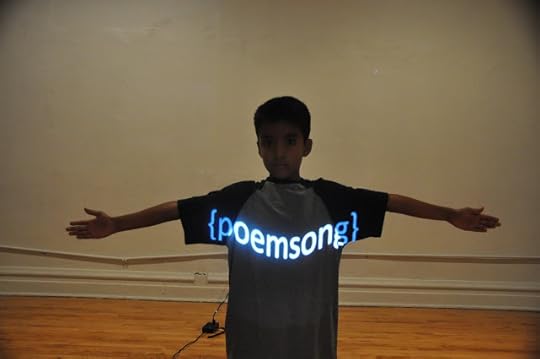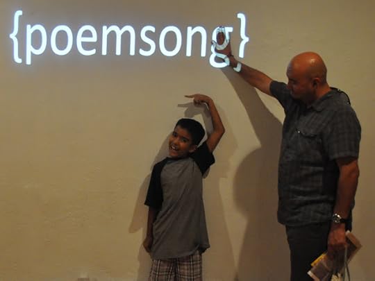 So, tonight, I'll remember two things from this performance. The first is Diego, and the second is his father Carlos, both of whom came to my performance with my friend, the Bolivian poet Veronica Lucuy Alandia, who did a great job capturing video of my performance, even though the machine decided to mangle the audio a bit. What I remember from the show is that Diego moved to the front row so he could see me better, that he sat there watching me with a huge smile on his face, and that he played with the projected final slide of the visual part of my show and, in doing so, made himself into a poemsong. And I remember that his father Carlos, also from Bolivia as was his wife Veronica, changed his own son Diego into a poemson.