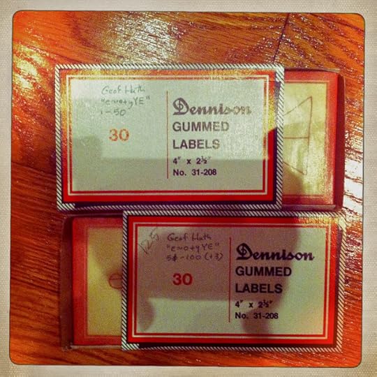 I have spent the last few days drawing by hand on ancient gummed labels (lick the back of one with a tongue and you can stick it anywhere). I was drawing a little fidgetglyph, a definite wrawing (half writing, half drawing), and there are many imperfections in the 103 versions I created. There is no perfection here, only a yearning for it.