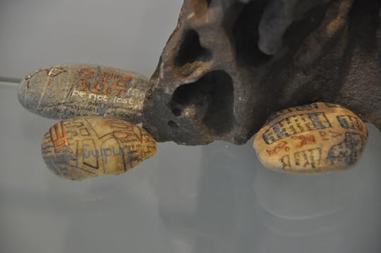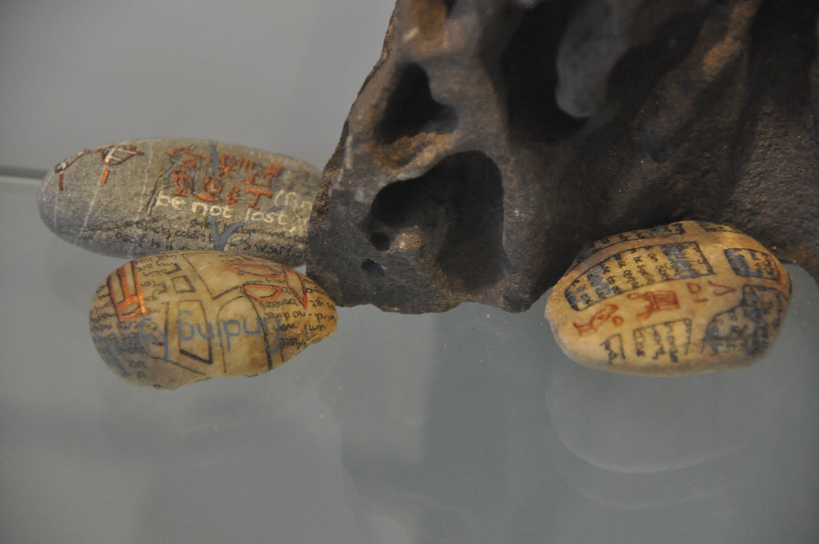 Only one of the constellations of objects does something with objects not from the Bury Museum's collection, and that is this one, which includes a rock that is joined by a trio of rocks painted and worded by Helen herself. These were hard to read, but they serve to be reminders of humankind, cultural objects noting the interests and intellects of humans in the cold and thoughtless natural world.