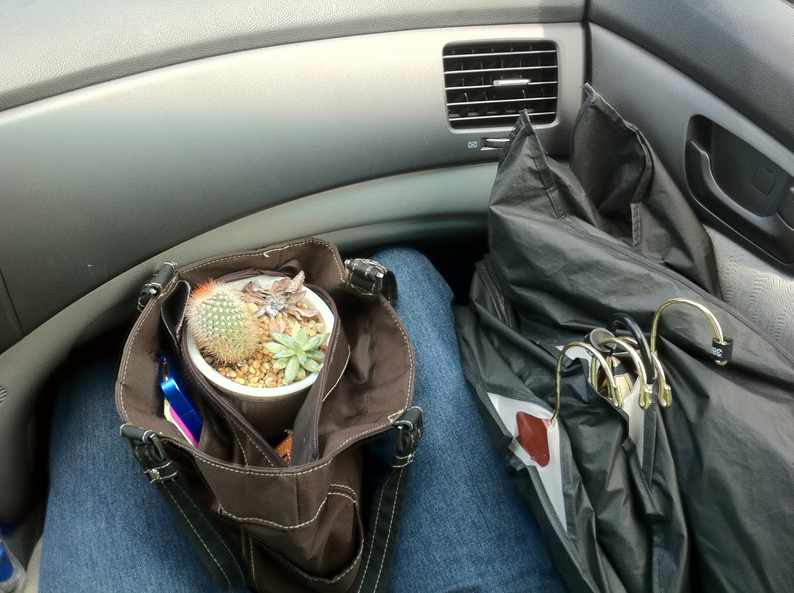 In my lap above is Nancy's purse with a pot of succulents in it. And note the garment bags beside me. That might look like tight packing, but usually the passenger has to hold a huge pile on a lap after packing up Tim.