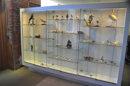 Helen White's Installation, Bury Art Gallery, Bury EnglandOne of the most beautiful pieces at the exhibits for the Text Festival in Bury, England, was Helen White's installation. Upon the many glass shelves of a large vitrine on the lowest floor of the art gallery, she had placed constellations of (primarily natural) artifacts from the museum's own collection, and then she pinned little labels in place on or beside these objects.