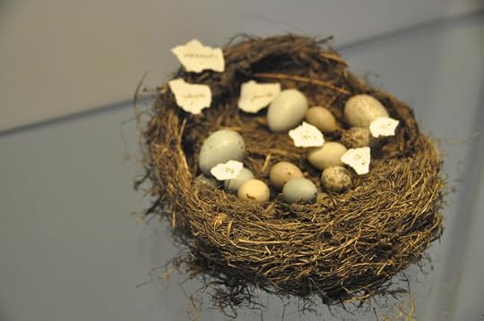Sometimes the pictures I took did not focus on the words themselves, as in the case of this picture, focused on the forward-jutting lip of this bird's nest. This collecting mania I mentioned is clear in this object. Birds' nests don't change much over time, so the saving of one is an interesting action of keeping the world from disappearing, and this one is filled with eggs of different birds, making it a kind of United Nations of ornithology. I wonder exactly how Helen was set loose in the Bury Museum's collections to identify the objects she wanted to use and to label.