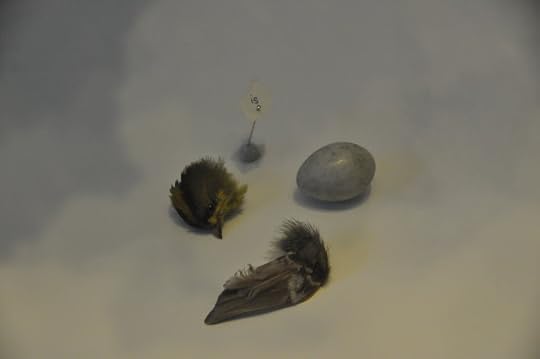 Related to the bird's nest is this spooky little triad: the head of a small, probably immature, bird, and its right wing (but no more of its body), and an egg that represents its beginning and its now-lost wholeness, and all of this tagged with the single word "is." For, even in this state of fragmentation, the bird still is.