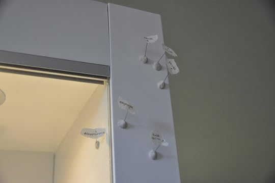 I almost missed it, but Helen also labeled a constellation of nothings outside the cabinet, giving its labels like "resist," "insist," and "persist" (the objects resist definition, the labels insist otherwise, but the connections between the two and the objects alone and themselves persist), and "disappearance" (because the labeled windowglass is not about being seen but being seen through, and because this large artwork will be dismantled after a few months).