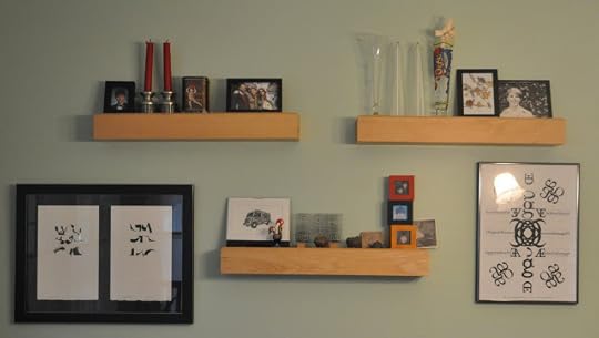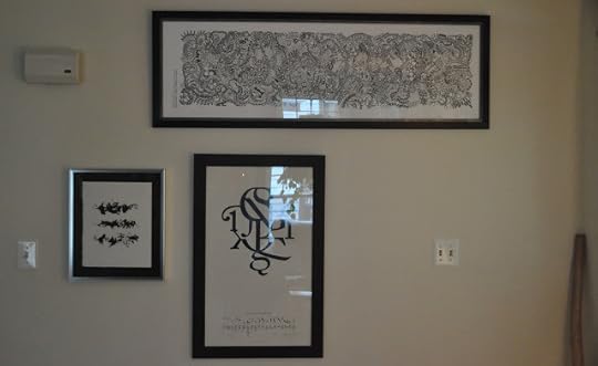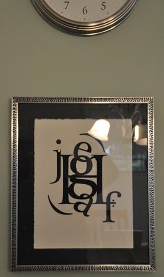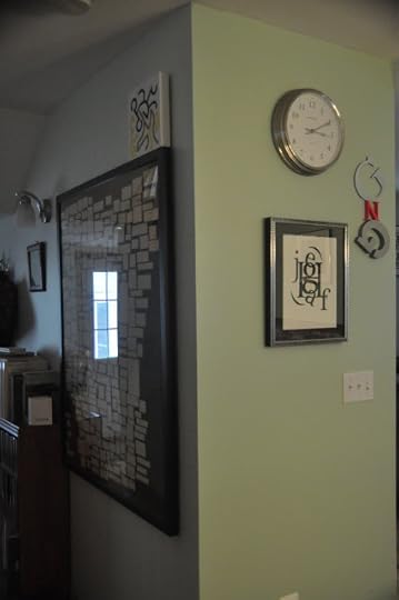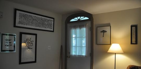Yesterday, Nancy and I hung quite a few framed pieces of visual poetry up around the house. We had collected these works over the course of five or six years, and we had them framed almost all at once over the course of three months. The people at the art supplies store and framing shop we go to came to know me by name, and they liked the work we brought in (which also included a double lifesize portrait painting of me by Didi Menendez). My photographs do not capture the beauty of these pieces, but they fill me with hope, because I am a romantic.