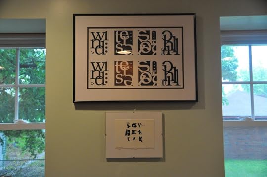 Deeper into the diningroom, there is a pair of Scott Helmes' typographic pieces ("Haiku # 49" and "Haiku # 81") framed together and mirroring my poem, "THEspaestfbetwee" (which I realize must be lowered a couple of inches).
