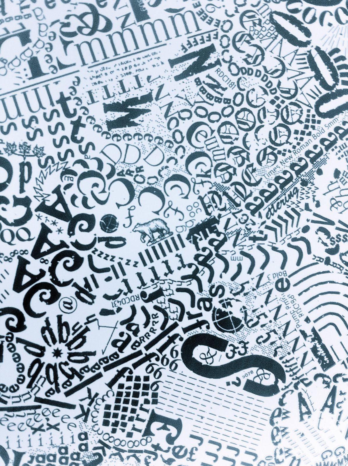 In spots, there is chaos: the breaking apart of the curves, a tendency towards irregularity, shapes of letters or punctuation or simple bars pushing thorough streams of other letters. Typefaces proliferate. The plastic lettering of the Letraset type shows its age, cracking and flaking over. And at the edge of the poem, you can find scattered flakes of Letraset that would just not sit in place. Also, you find the occasional real surprise in this mass of thousands and thousands of characters, such as the bear passant above, a little bit of heraldry that might remind us of Canada itself.