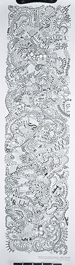At times, what restricts the manic arcing of this work are straight lines of text, which do not bring other to the text, but which hold it in abeyance for a while, for a matter of inches. These straight lines are like roads through a forest. They add some definition and stop some growing, but they cannot hold it all back or in place.