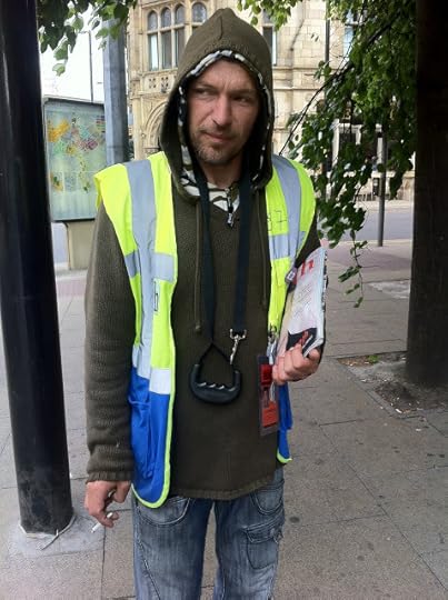 Tim Dixon, Street Vendor of The Big Issue (29 April 2011)The start of the day was quite remarkable. I met up with the poet Phil Davenport, Gemma from The Big Issue, and Daniel from the local station of the BBC, and we visited four homeless men who make their living by buying copies of The Big Issue for £1 and selling each for £2, thus making a 100% profit. These men we met make their living that way, and exist in various states of homelessness, some having made it into flats they share with others.
