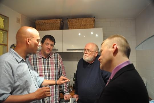 Alexander Jorgensen, Stephen Nelson, Ron Silliman, and Christian Bök, Manchester, England (29 April 2011)This party for the artists participating in the Text Festival was a huge event, one that allowed me to meet many people I'd never seen in the flesh before: Helen White, Marco Giovenale, and others, which added to those I'd met yesterday for the first time, Steve Giasson and my good friend Marton Koppany. (My Facebook wall is filled with photos from this even.)
