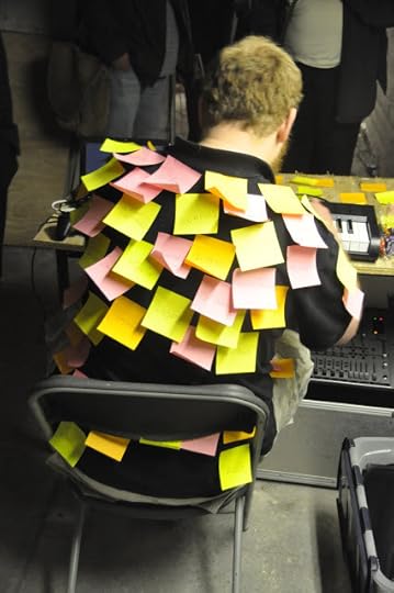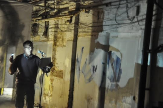 Andrew Faraday Performing His Sound Piece in the Basement of Warth Mill, Bury, England (1 May 2011)After a break for lunch, we made our way to a distant outpost of Bury, to Warth Mill, which served as an internment camp for refugees from Nazi Germany during World War II, and which once housed Schwitters himself. We were in the basement of this facility, which was much like a cave, but filled with broken walls, breaches outward toward daylight, and all manner of dirty and broken equipment and supplies. It was a filthy and, thus, unforgettable space. In this spot, I found two broken bird's eggshells and wrote a poem on them, while we listened to Andrew Faraday play strange music through the space while he was covered with sticky notes.