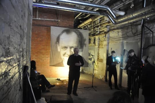 Ian Hunter Introduces "Ursonate" as Christian Bök Reads His Script by the Light of the Flashlight of My Cellphone (1 May 2011)Soon "Ursonate" was set to begin, so Ian Hunter introduced it. All the performers, except Jaap Blonk, needed to read from a copy of the script, so I lent them my cellphone with its flashlight app shining brightly.