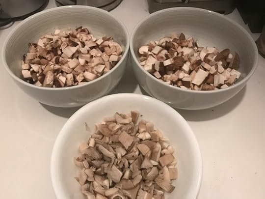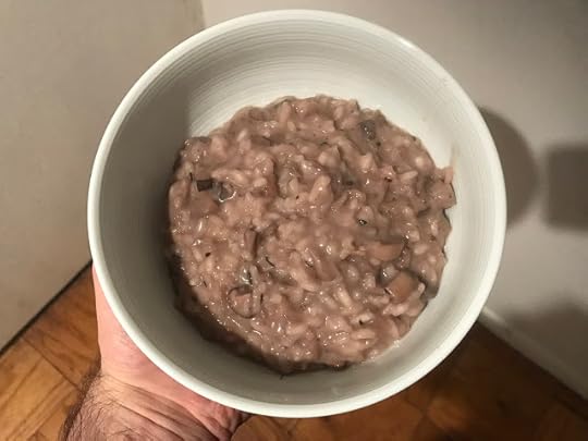 The risotto was a complex affair, as it always is. I like only my risotto. Restaurant risotto is always too dry, and often not al dente. The flavors are too muted too. I diced onions, minced garlic and cooked them down in olive oil and butter. Once they turned clear, I tossed in about a quart of diced mushrooms of different colors and scents. More oil. I let them soften. Had only red wine so I added some in to help cook them down.