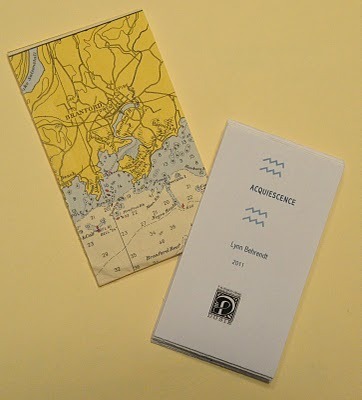 The book itself is comes inside a little envelope, which is made by taping together two rectangles from an atlas. On one side is a view of the Long Island Sound, showing much of the north fork of Long Island and the coast of Connecticut to its north. On the other side is a much more detailed map of Branford, Connecticut (a map so interesting to me that it led me to write a poem about it: "286. Adamic & Cartographic").