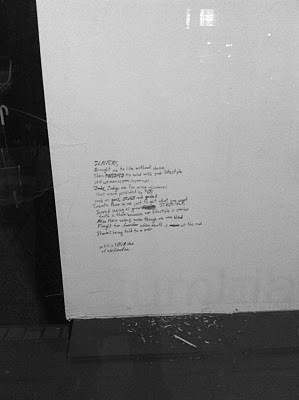 Just after having met a woman who teaches English Columbia College Chicago, an art school, I walk past what I presume is an exhibit of student work treated text as image. But also as word.