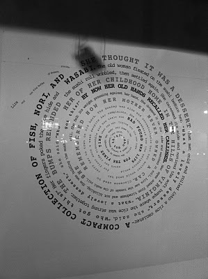 Almost returned to the 1970s with this piece, which resembles Kriwet's rundscheibe, but this is a spiral. Nicely designed, though easier to do now than in the 1970s, though ease doesn't lessen the value of the work.