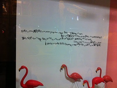 Before I left, and around the corner, I found these now-drunken flamingos under this twice-drunken text.