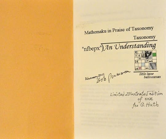 Finally, my thanks to Bob for giving me a special limited edition of one of the book, with a copy of one of his mathemaku pasted in. I've filled my copy with pencil marks of various kinds and notes to myself, but it is still a perfect copy. And I used pencil because I'm an archivist.