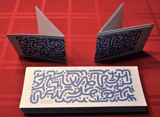 The genesis of this card is like that of all of these cards: I wait until an idea occurs to me when I'm not thinking of the card. At first, I thought of making the cards wider than they are tall and to draw something across the eventual crease in the wrap-around cover. But that wasn't enough, so I didn't start working on that idea. Today, while finishing a little prep work for the transfer this week of more of my papers to the University at Albany, I came across a partial ream of blue speckled card stock, and that told me that blue was the color to use.