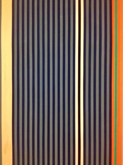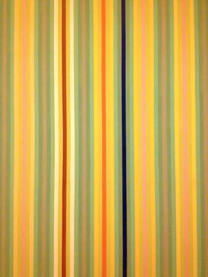 Today, I stood and stared, as I often have, at Gene Davis' "Sky Wagon," a painting from 1969 measuring nine feet and ten and 3/4 inches tall and 54 feet and 5 and 1/2 inches wide. The painting is too wide to appreciate in full in one eyegulp, and it doesn't work that way anyway. It is still beautiful, straight after straight vertical line of acrylic five storeys recumbent. In such a view, you see the colors as they change, you see the bundles of light colors struck through with a discordant line of color, but you don't live within the painting.