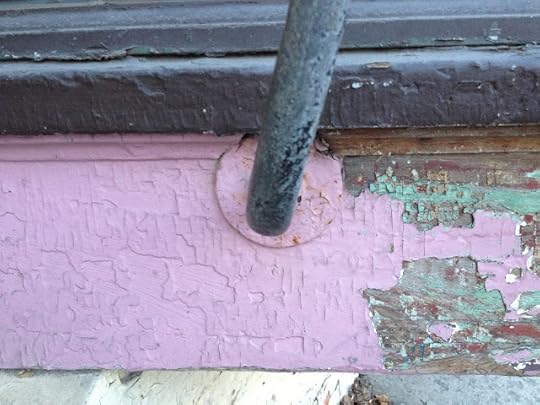 Does the color of rust, almost red, add to the sense of blood, even in the absence of oxygen? If you scrape far enough through the pink, does green appear, or bare worn wood tinged with green? Who lives on that pink island in that shallow sea of green?