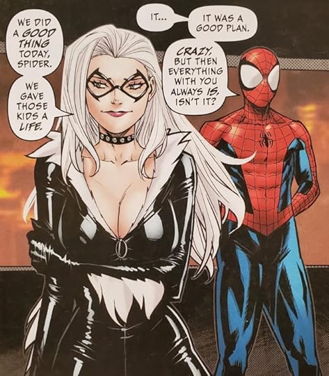 Spider-Man and the Black Cat team-up for a heist in Cat’s first annual by Jed MacKay, Joey Vazquez, Natacha Bustos, Juan Gedeon, and Brian Reber. (Black Cat Annual #1, 2019, Marvel)