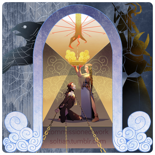 This particular drawing has rendered itself somewhat momentous to me, because at the time that my utterly lovely, patient, saint-like commissioner requested it I was seized with SO MANY visions of how to accomplish it, and drove myself crazy trying to do justice to the mythos of the situation and the very unique relationship between Loki and Sigyn that can be inferred from the glimpses of her we still have. In the end I was struck most deeply by the phrase used to describe Loki as “the burden of Sigyn’s arms”, which brought to mind a very specific sort of temperance and strength not necessarily wrought in muscle, but unwavering loyalty.