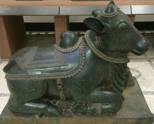 Besides being Shiva’s vehicle, Nandi is also the chief of the god’s team of ganas or attendants, and consequently he often carries a golden staff of office. His other duties include being the guardian of all quadrupeds and the provider of music as Shiva dances the tandava, the cosmic dance of creation.