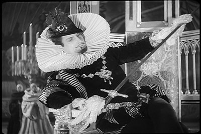 Eisenstein makes similar use of other characters. Ivan’s aunt, who bears little or no resemblance to the historical princess of Staritsa, wants power too, but for her son more than herself—although we all know who will wield that power if she gets it, because her son is presented as a buffoon. Like Ivan’s wife, his aunt cares about relationships, something Ivan has no compunction about destroying. That wife adores him, although she can’t quite resist Kurbsky’s seductive gaze. The members of Ivan’s private army adore him too, even as their homosocial extravaganzas introduce elements of gender diversity that intertwine with the theme of power in the persons of King Sigismund of Poland and the (never filmed) Queen Elizabeth I of England, whom the historical Ivan IV once petitioned for asylum and whose lady-in-waiting he sought to marry.