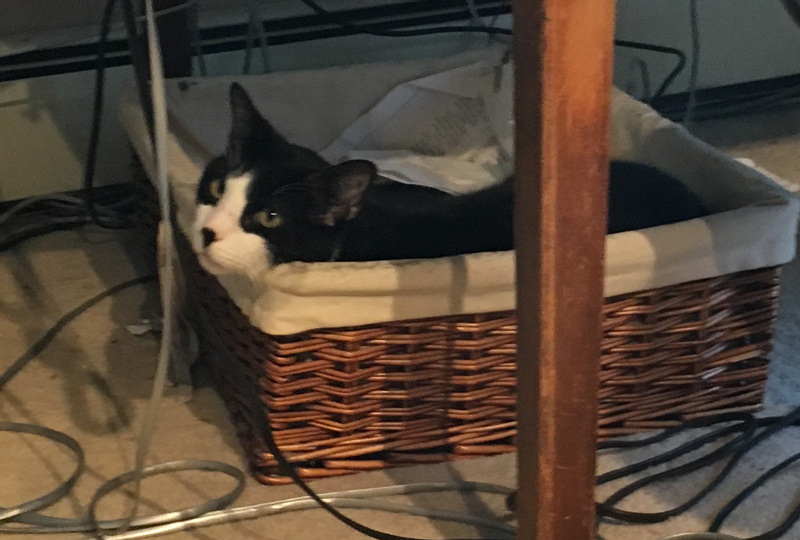 Images: Cat #1 enjoying his leisure time; Cat #2 plotting her next foray; Cat #3 in a basket wondering where he went wrong and what he has to do to get the Filial Unit to take him home, where he belongs.