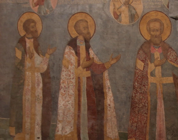 Images: Prince Andrei of Staritsa and his older brother according to a 17th-century fresco on the walls of the Archangel Michael Cathedral in the Kremlin; Elena Glinskaya and her husband, Grand Prince Vasily III; the death of Elena Glinskaya according to the 16th-century Illustrated Chronicle Codex—all public domain via Wikimedia Commons.
