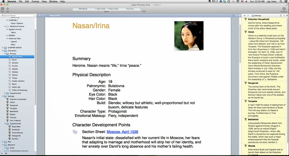 The third screen shot comes from The Swan Princess, the book I started this summer. So far, I have only about ten pages of text, which is sure to change as I write, so instead I’m showing the individual character sheet for Nasan, the heroine. It includes fields that came with the program (age, gender, eye color, hair color, build), fields that I defined (patronymic, character type, emotional makeup), my image of the character, and moments in her development—her character arc—linked to scenes in the story where that development takes place. I can show and hide these fields as I like. On the right I’ve displayed the novel’s main settings in outline mode, the third available option (besides text and grid—that is, index cards or photographs). On the left sits the usual list of folders, expanded to show different sets of information. I can get rid of windows, stack them on top of each other instead of side by side, or go into full screen mode and show only the manuscript.