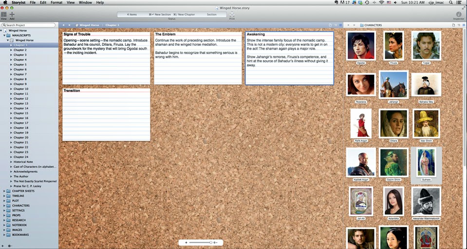 The second screen shot shows a different view of The Winged Horse. Here you can see the chapters of the novel listed on the left. The character images still appear on the right, but the center manuscript has become a set of index cards representing chapter 1, each containing notes about the individual scenes—their purpose in the story, what they need to convey. If I were to double-click on a card, I would enter its collage, where I could write comments or drag pictures of the characters and settings associated with that section.