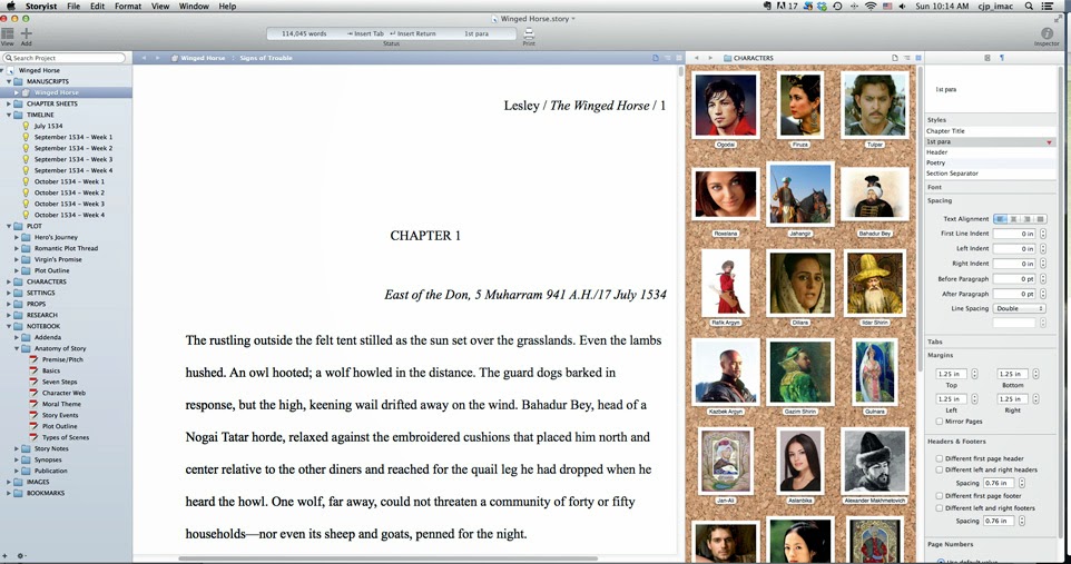 Here you see the opening paragraph of The Winged Horse, combined with a photo gallery of my characters (I’m an intensely visual writer, so I love to imagine my characters while I’m telling their stories). On the left, you can see the Project View, which lists the different kinds of information that Storyist can hold: plot points, character and setting descriptions, research, notes and writing exercises, synopses and more. Already we’re in territory a word processor can’t touch, where I can write in one window while displaying other useful information in various ways.