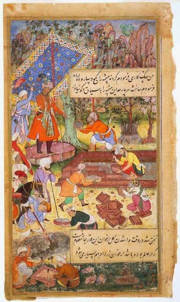 Nasan herself later summarizes these principles, again in contrast to what she sees before her in the Russian court: “Although richly decorated, the palace lacked the harmony of Muslim architecture—its lightness, its grace, its perfect proportions. Here no opaline swirls of marble refracted with lunar subtlety the rays that pierced filigreed walls, no turquoise tiles glowed more intensely blue than the sky above them, no looping black-dotted calligraphy captioned brilliant miniatures of everyday life” (392). The buildings she has in mind consist of interlocking courtyards edged with rooms and terraced passageways, each with its pools, fountains, and elaborately planned, mathematically precise gardens—a style that characterized the Tatar khanates of Central Asia and the Mughal palaces of India just as much as those of al-Andalus and Istanbul. The founder of the Mughal dynasty, Babur the Tiger—himself a Tatar prince of Central Asia—was so devoted to his gardens that he decreed his own burial in his favorite, located near Kabul. And there he lies to this day.