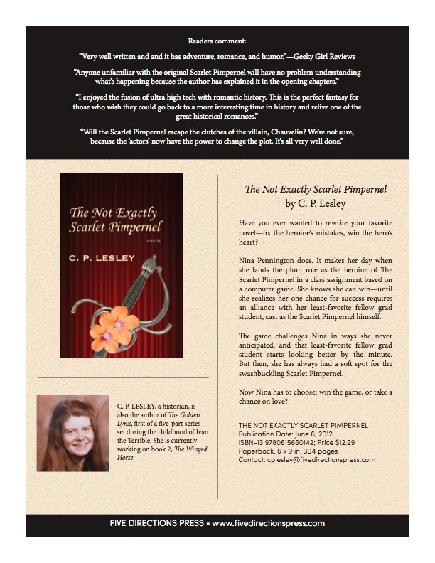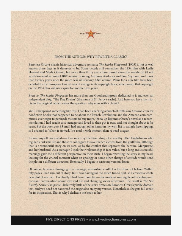 My woeful ignorance changed when I became the host of New Books in Historical Fiction. Publicists began sending me press kits together with review copies of the books whose authors I planned to interview. After a while, it dawned on me that I could use these as models to spiff up my own miserable efforts, a task now mostly complete. So what did I learn? What is a press kit? I’ll use the one I created for The Not Exactly Scarlet Pimpernel as an example (but keep in mind that others may—and probably do—have a better grasp of the form than I do).