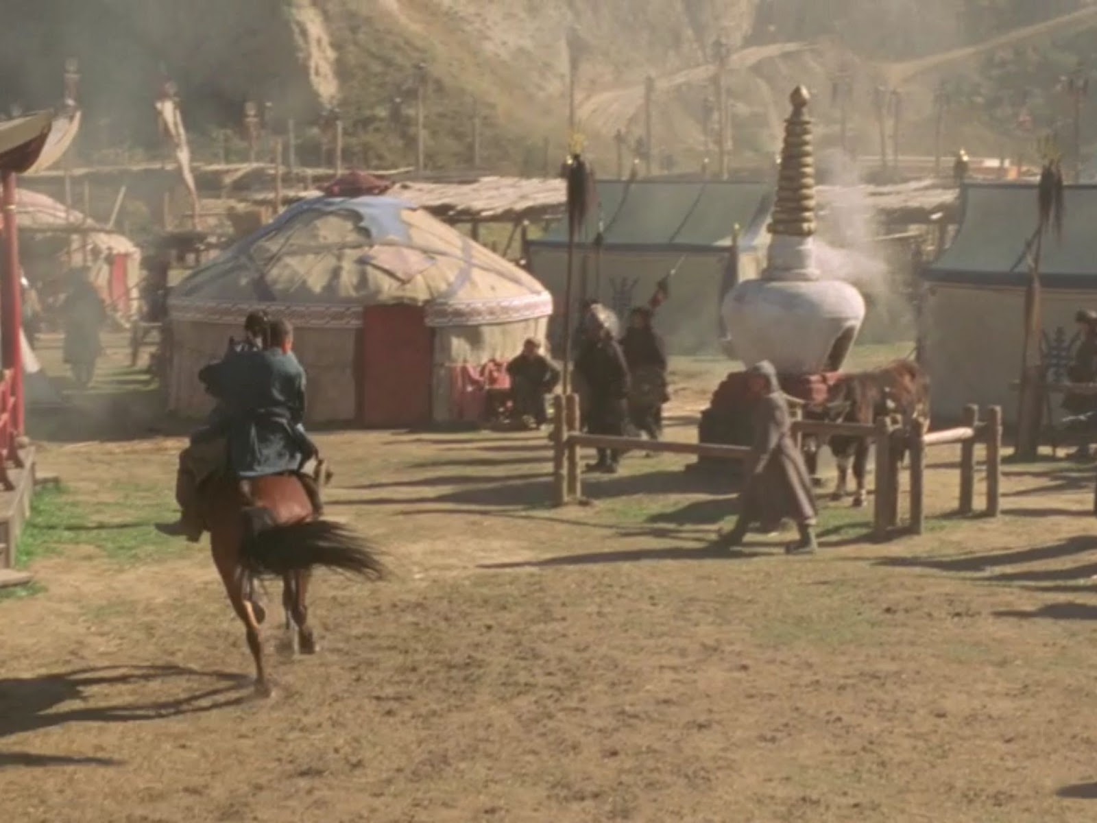 Something similar happens in Nomad: The Warrior, another Bodrov film, when the heroine, Gaukhar, agrees to marry the antagonist Sharish—and stop attacking his men with her dagger—because he promises to spare her brother if she cooperates. The hero, Mansur, kills Sharish before he can claim Gaukhar, but when Sharish’s people then ensnare Mansur, he doesn’t rescue Gaukhar. She rescues him.