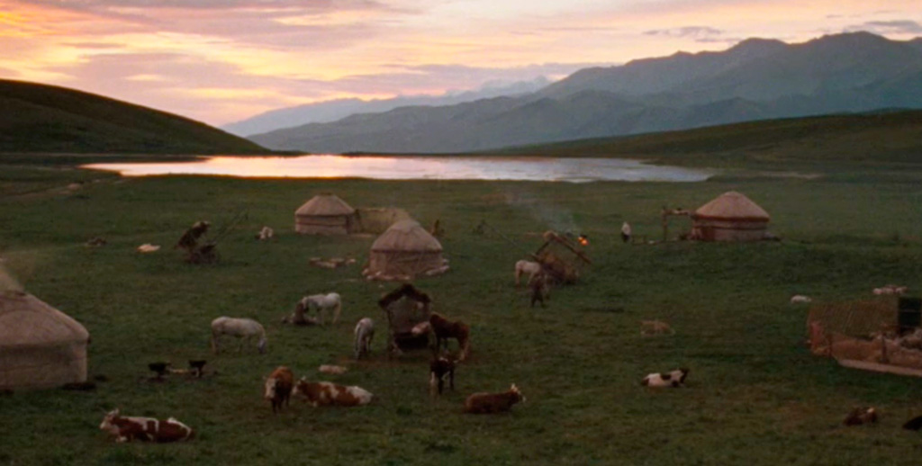 And she has to rescue him, because Sharish’s mother, having watched Mansur survive two trials, has decided to take matters into her own hands. She grabs a handy viper and poisons the milk sent to honor the victorious hero whom the enemy khan has agreed to release on the morrow; only Gaukhar’s intervention protects him from a female enmity more implacable than anything the men can produce. Another woman—Hocha, the enemy khan’s daughter—has already risked her life to save Mansur by offering him marriage. He refuses, presumably because he loves Gaukhar. Therefore, it is Gaukhar who saves him. (For more on Nomad as a film, see “The Wild East.”)