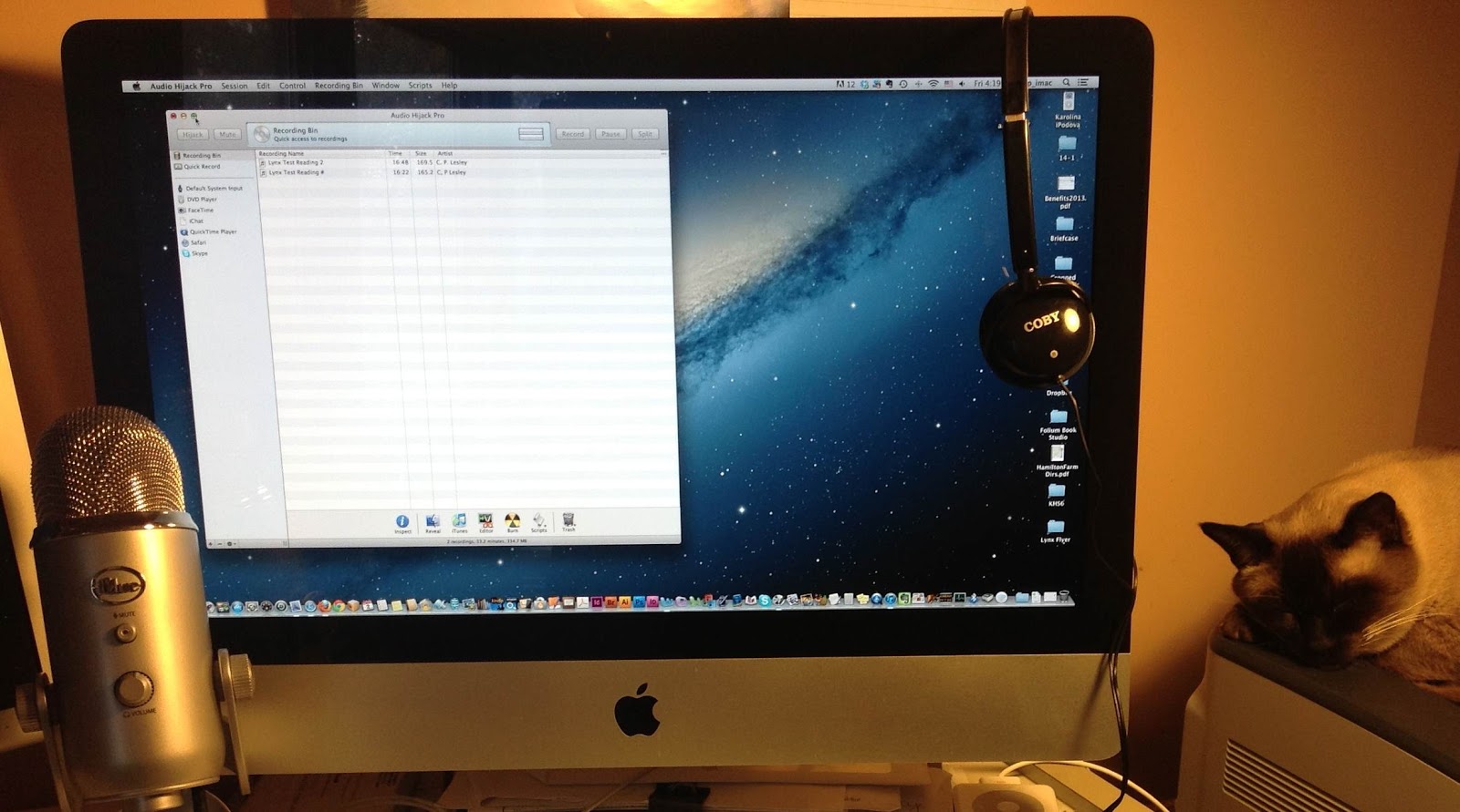 I checked my microphone and recording equipment, as recommended in the NBN Hosts Manual. Well, I knew the microphone was working, since it had picked up the jungle purrs. But the Skype test call didn't record (I think I mentioned in a previous post that I am Skype-challenged). Then I realized the audio capture software works so much better if you click the Record button before recording. Sigh. I hadn't even made the call yet, and I was already down for two.