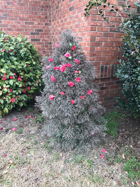Although still shaped like a holiday tree, the plant’s foliage had turned ash gray and brittle. Caroline eyed the plant thoughtfully, glancing between the obviously dead bush and a nearby flowering camellia. Her face, scrunched in thought, suddenly brightened. She lifted a finger.