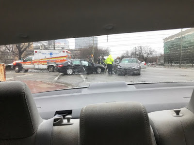 As I approached an intersection, I realized two cars had collided in front of me. Their front ends were crushed, and glass littered the street. Deployed airbags hung like curtains from the windows, blocking my view of the occupants.